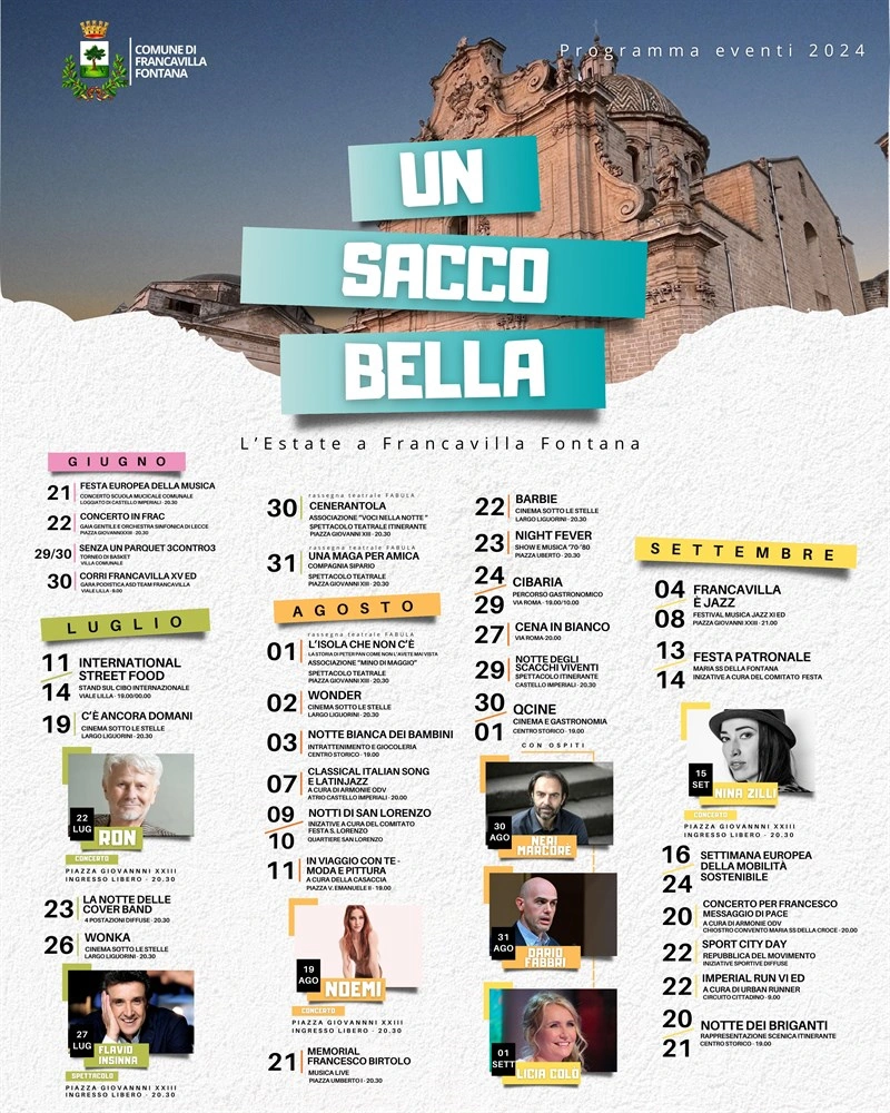 “Un sacco bella” è lo slogan scelto dall’amministrazione comunale di Francavilla Fontana per illustrare gli appuntamenti del cartellone estivo 2024.